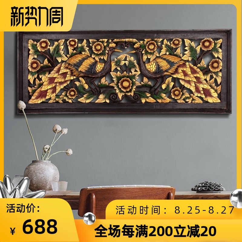 泰国雕花板东南亚实木木雕工艺品挂件 孔雀彩绘描金壁挂壁饰横幅热门设计联盟服务商