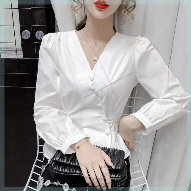 新款女泡泡别致领2021规则感小众上衣设计收腰秋装长袖不规则衬衫热门设计联盟服务商