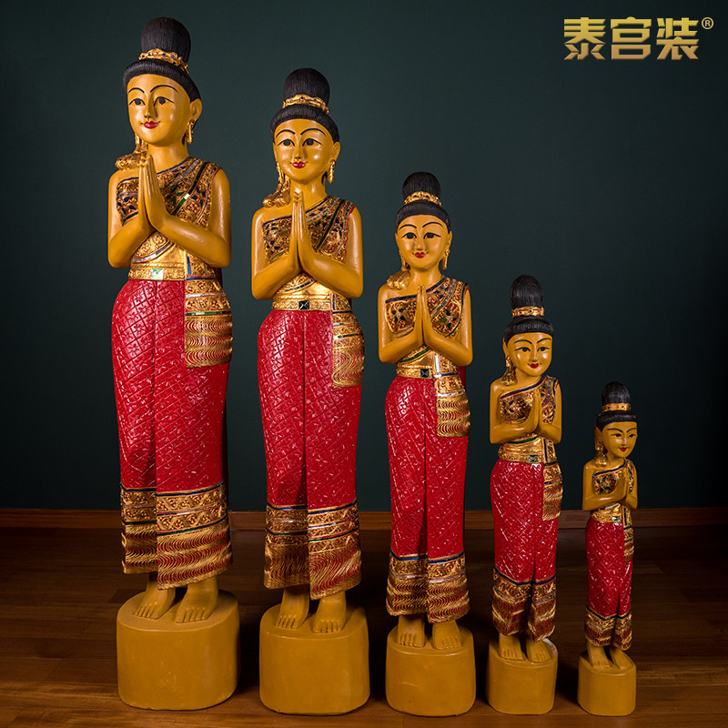 特价泰宫装东南亚餐厅会所酒店门厅迎宾摆件泰国木雕侍女萨瓦迪卡热门设计联盟服务商