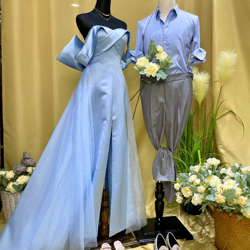 蓝色前开叉大蝴蝶结缎面2021新款影楼主题婚纱摄影情侣服装搭配热门设计联盟服务商